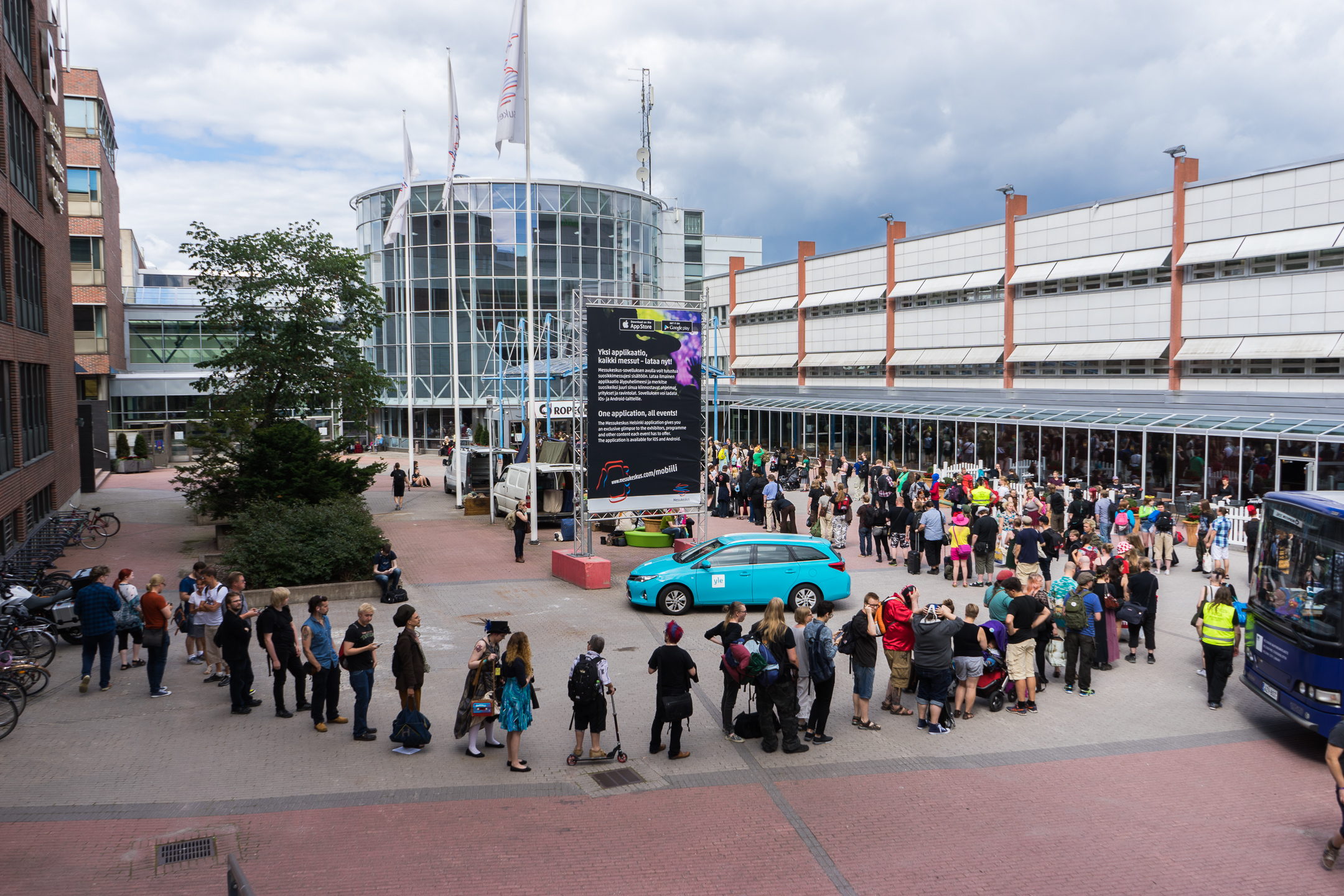 Lipunvaihto eteläisen sisäänkäynnillä oikealta puolelta ja badget sekä paidat infon ja narikan väliseltä alueelta.